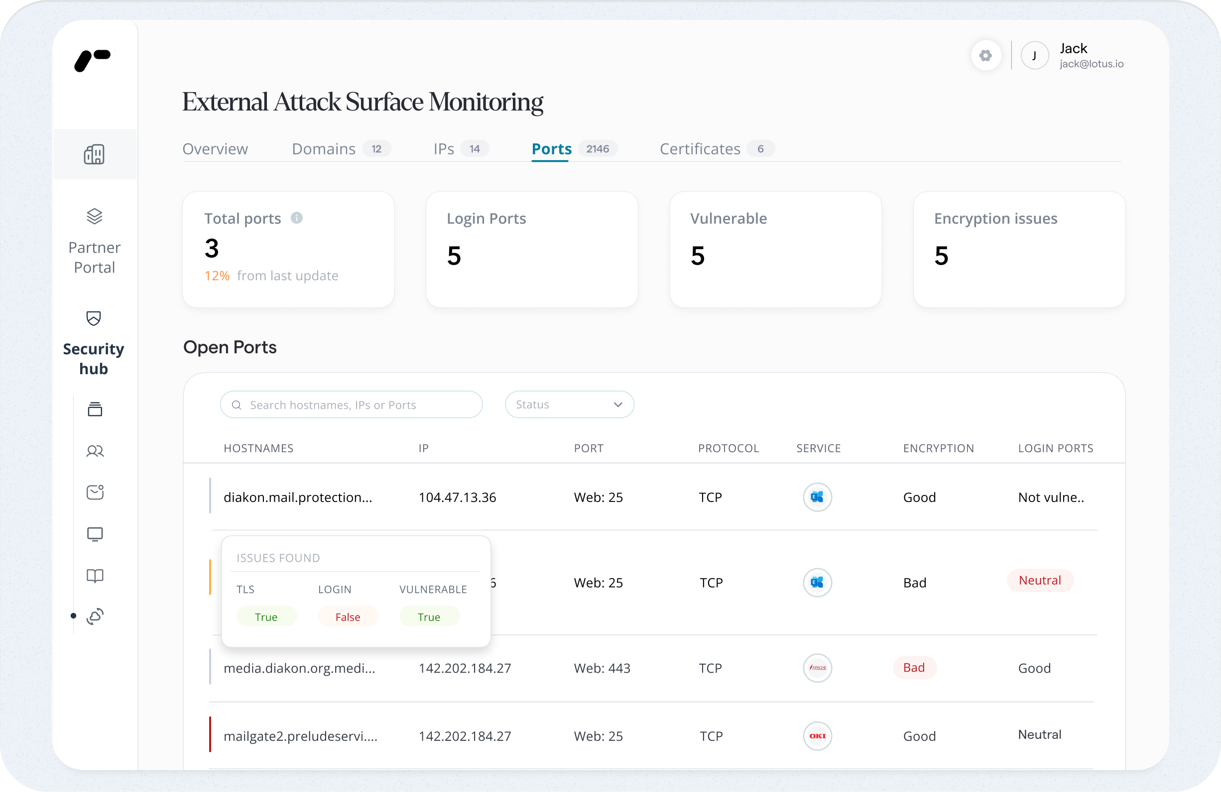 Unsecured ports are a prime target for cybercriminals. The Hub continuously scans critical entry points—such as web servers and databases—for vulnerabilities. Real-time alerts helps identify and close risky open ports before they can be exploited.