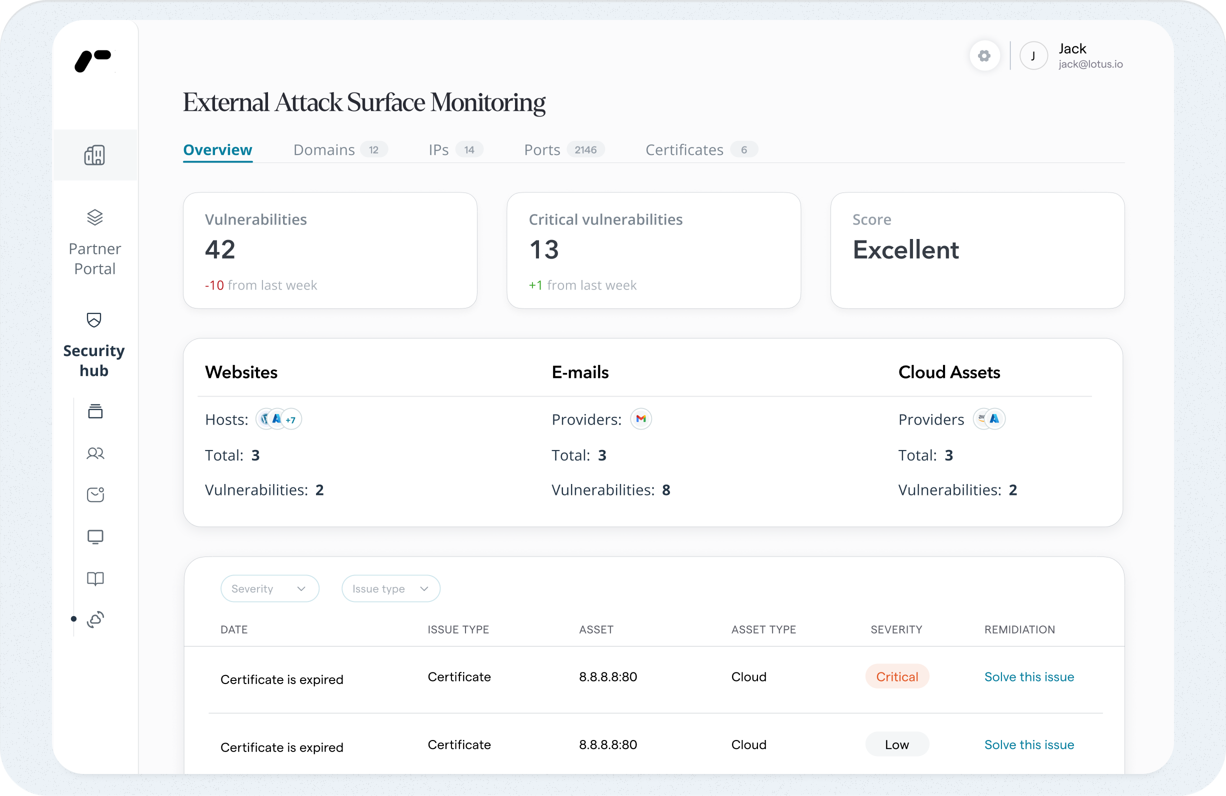Gain an unified view of all vulnerabilities and issues from one comprehensive dashboard. Streamline operations and enhance efficiency by managing risks across your entire external attack surface, to ensure the most critical issues are prioritized.