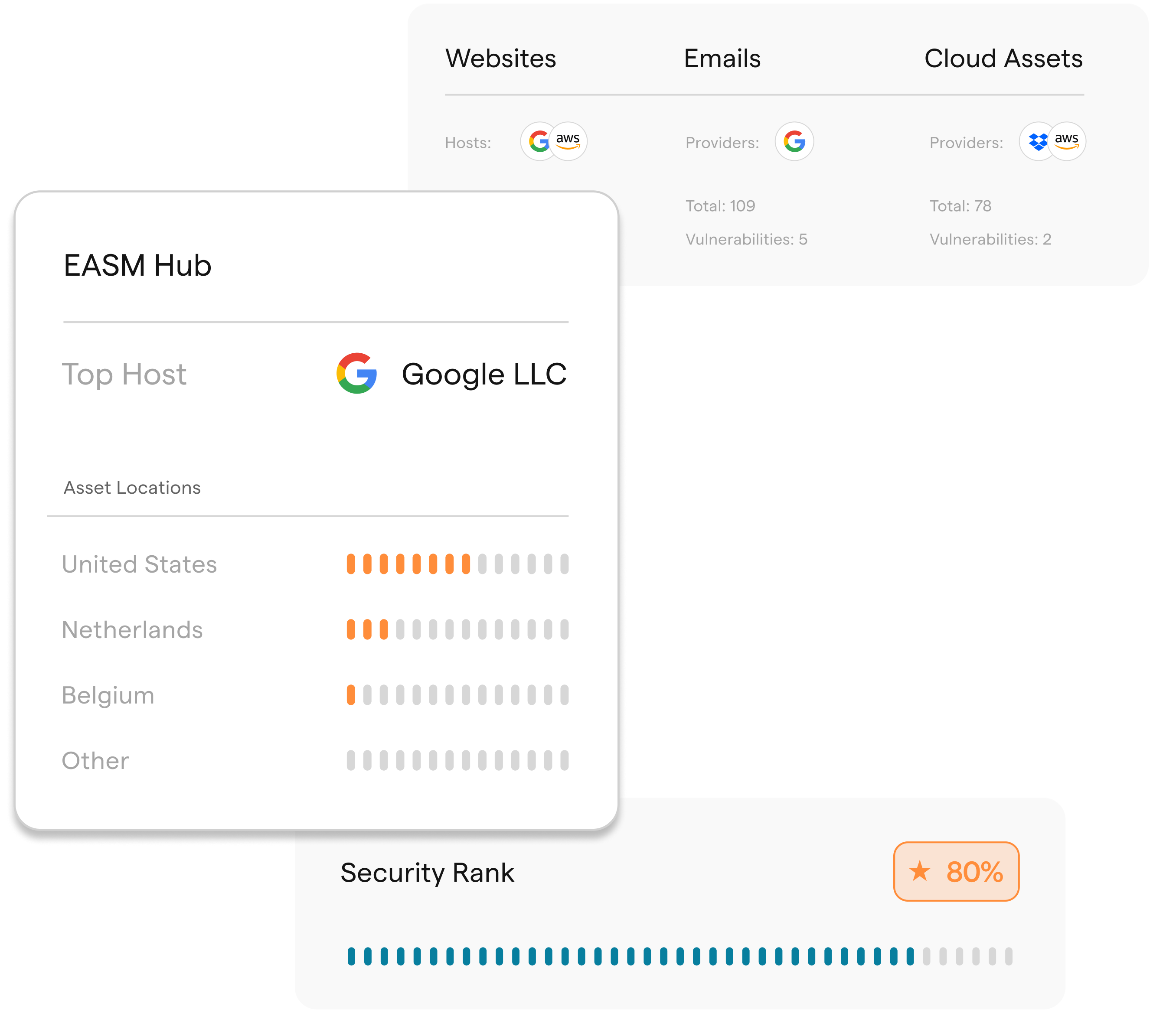 Strong cybersecurity requires constant vigilance against lurking and opportunistic threats. The EASM Hub keeps your guard up constantly, giving you visibility across your attack surface and high-precision intelligence.