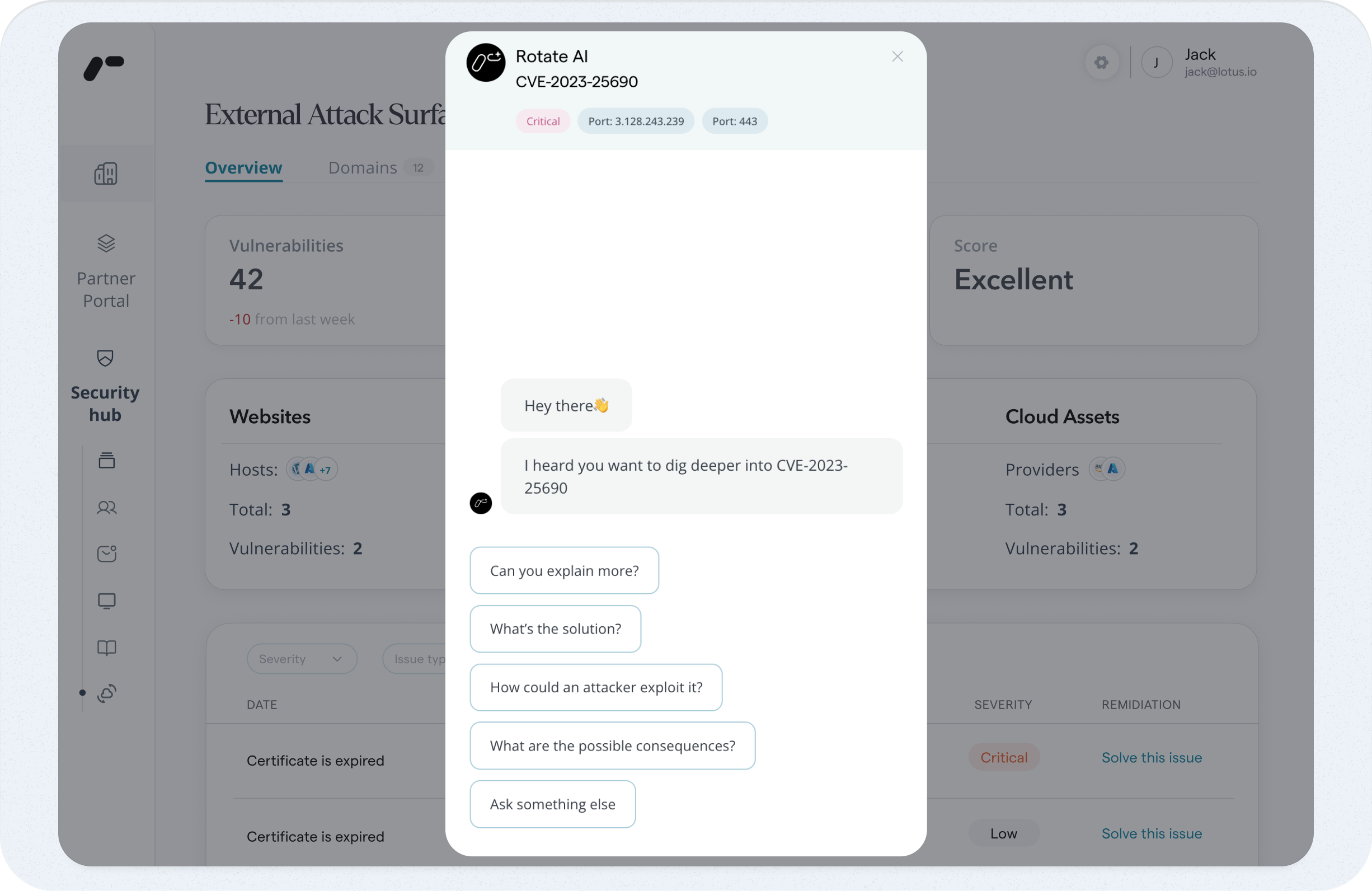 Use data-driven analytics to prioritize remediation efforts and strengthen your defenses against cyberattacks. You can depend on live support and Rotate AI to help you understand vulnerabilities and deliver step-by-step guidance to resolve every issue.