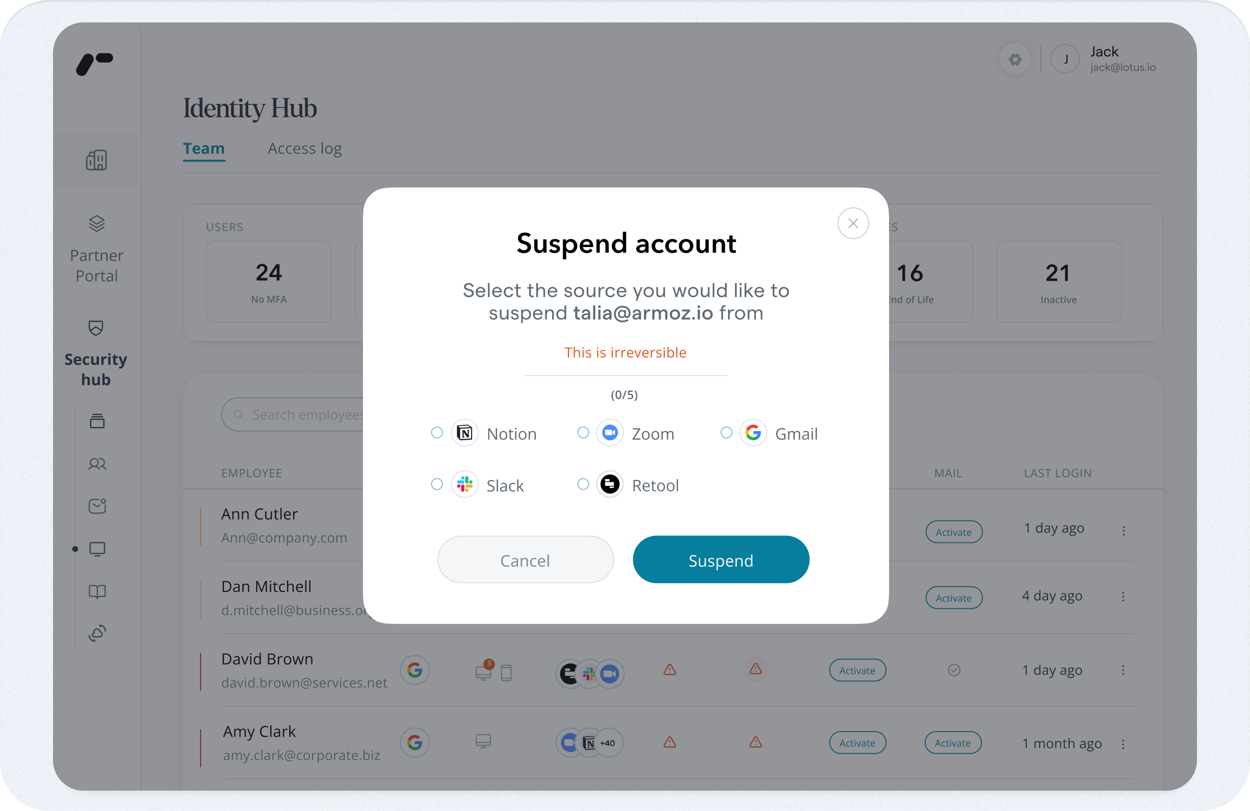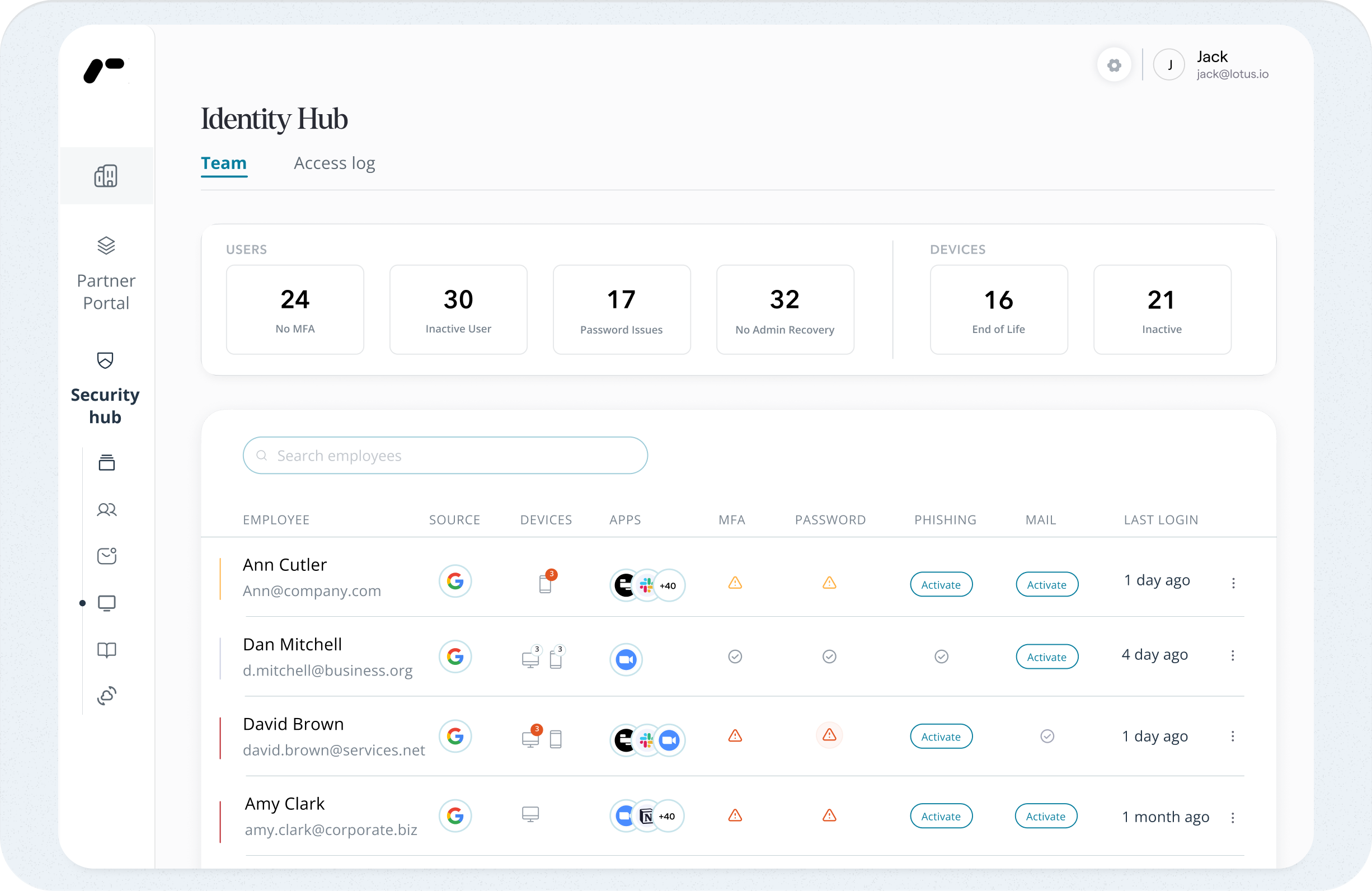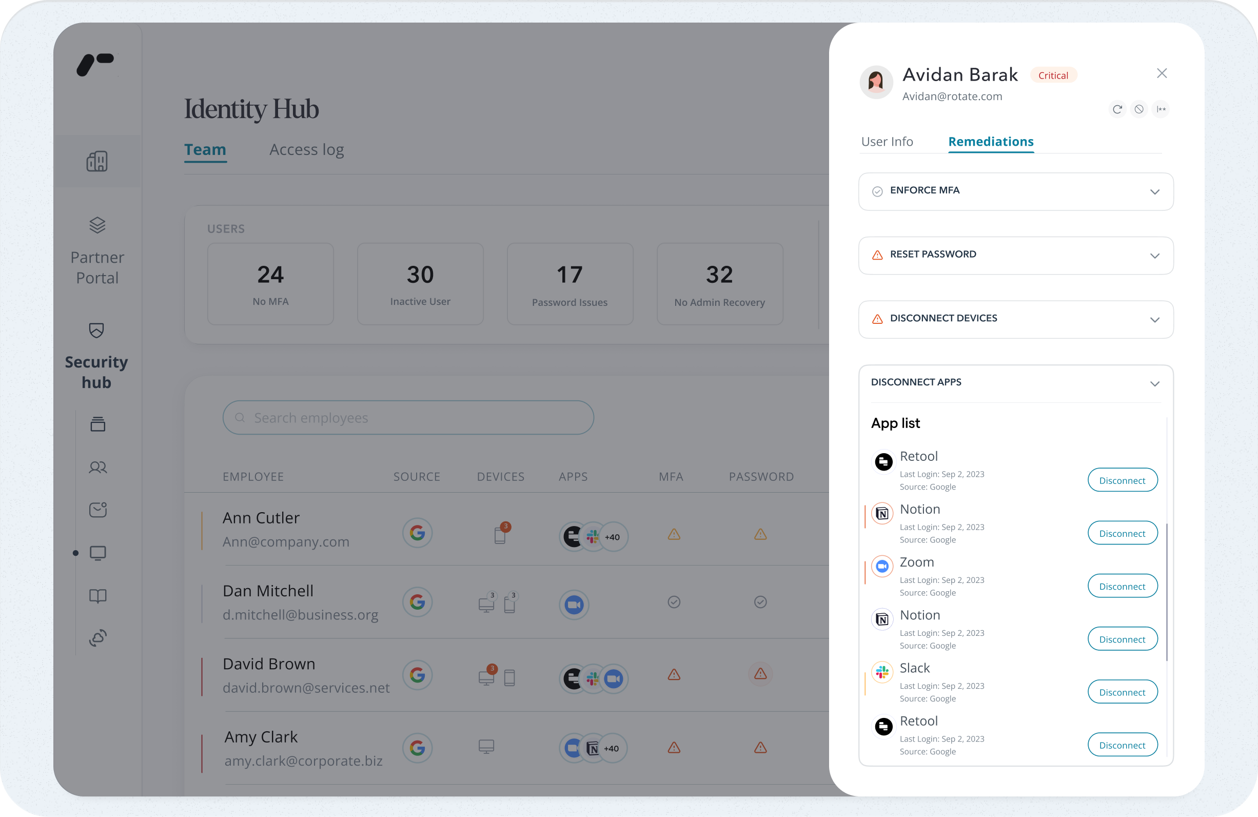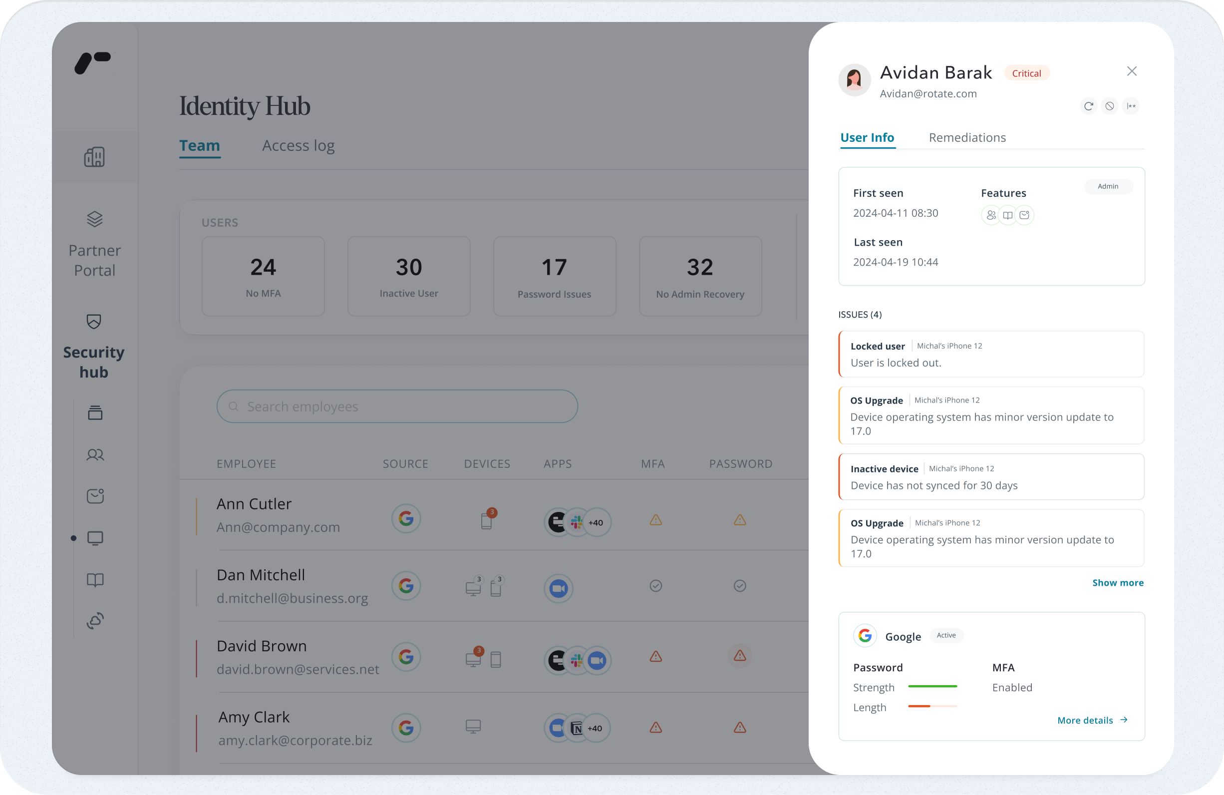 The Identity Hub is part of Rotate’s 360-degree cybersecurity platform, which also includes a multitenancy control center for partners and additional hubs that complement identity protections. The integration of the Identity Hub with Rotate’s other hubs allows you to: