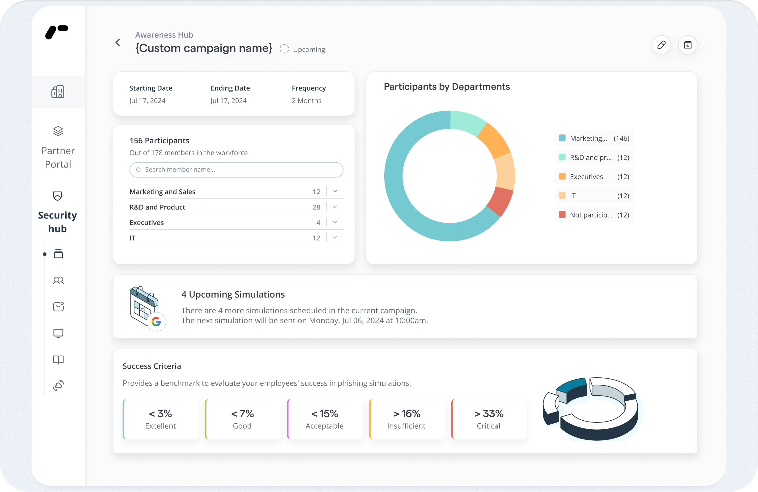 Gain insights through detailed analytics and reports on your team's results. These findings help you assess your organization's security awareness levels and readiness for a phishing event, and pinpoint areas that need improvement and further training.
