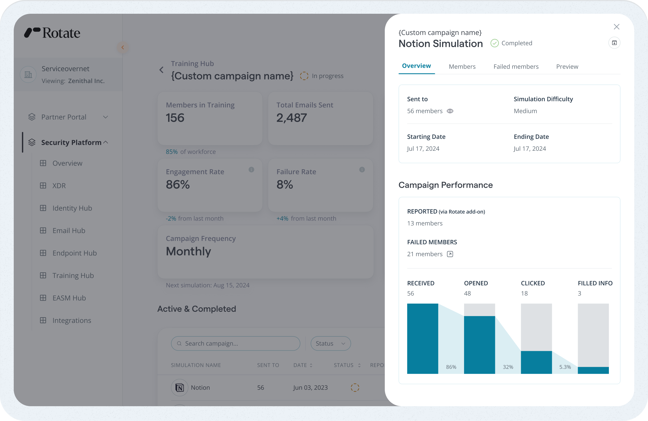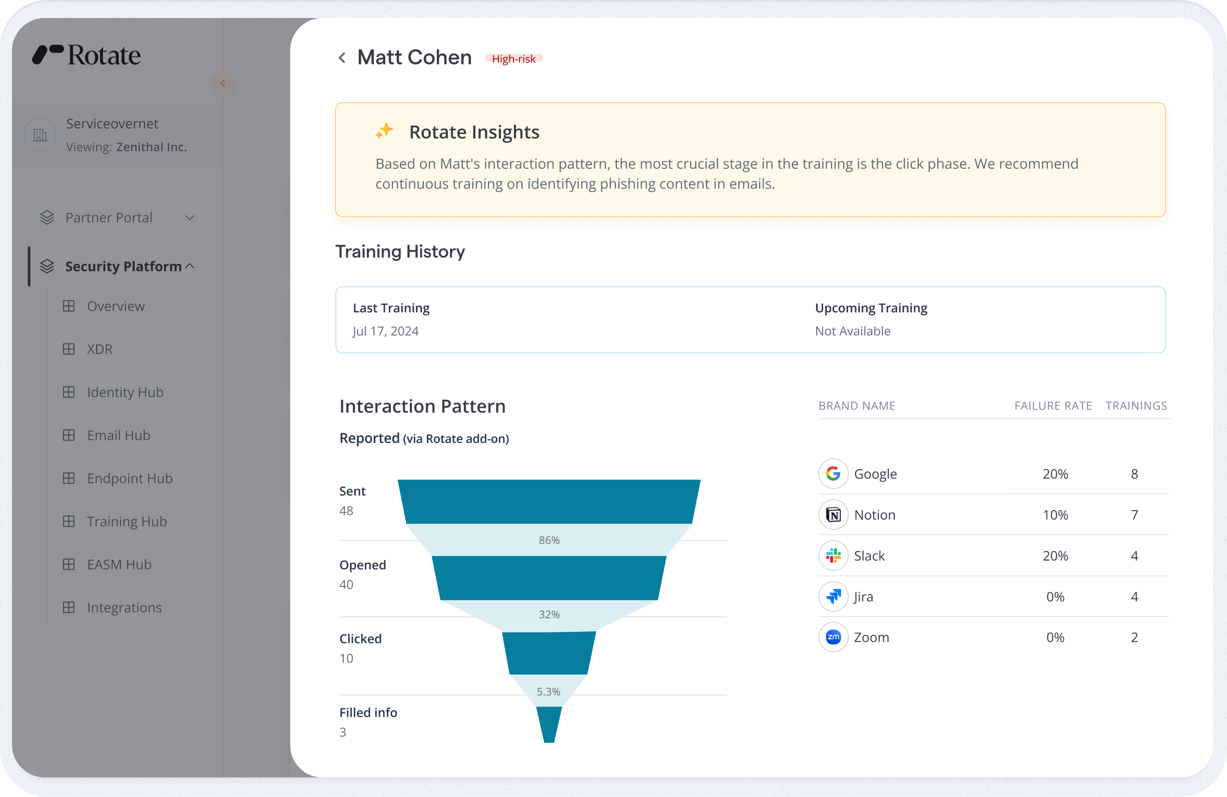 As part of a 360-degree cybersecurity platform, the Training Hub benefits from integrating seamlessly with Rotate’s other security hubs. The integration with Rotate’s other hubs gives you: