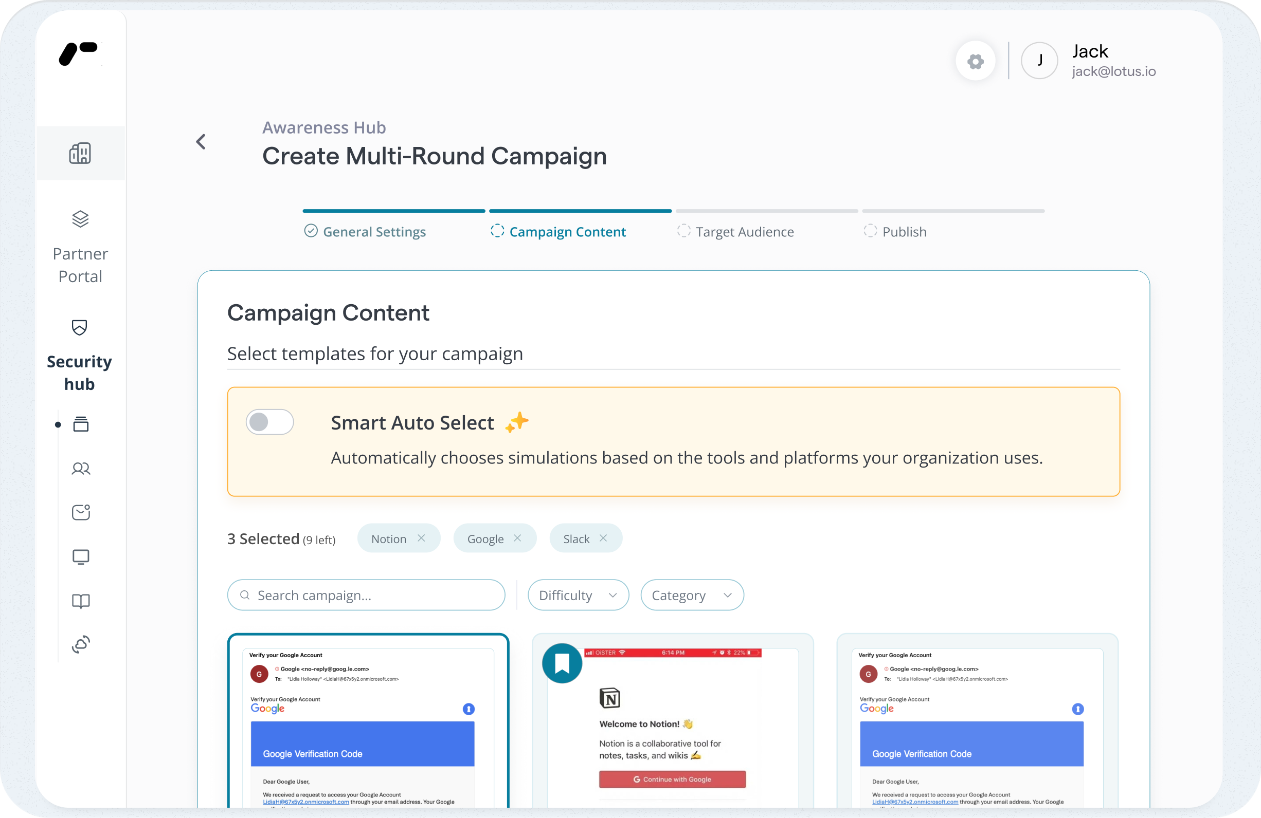 Simulation Setup: With just a few clicks, you can easily set up training simulations, preview test examples, and run them across your organization, or build your own custom simulations for your company’s unique needs.
